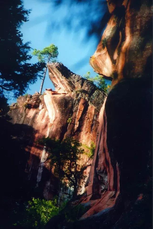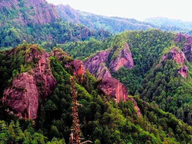 吉利吉是普米語“美麗的紅巖石”。入口處“滴水巖”兩側(cè)千仞絕壁,箐口無路可循,只能借助生長在巖縫里的藤蔓攀援上一側(cè)山脊,才能緩步前行,越過近400米寬的滴水巖絕壁,猝忽一片紅染丹涂的奇峰異石,這些高大壯觀,輪廓分明,造型奇特,惟妙惟肖的紅石嶺谷縱橫,深溝巨箐,峽瀑跌水的分割下,構(gòu)成千峰萬壑,處處絕壁的卡拉布丹霞奇觀。