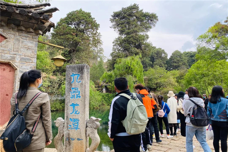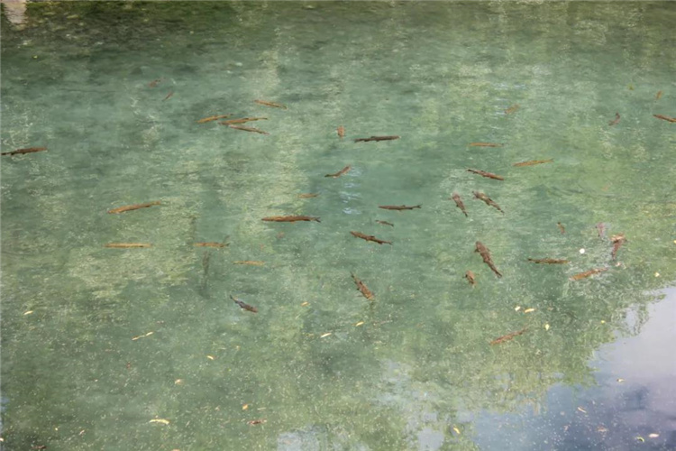 潭水從山腳石縫涌出,水不深,卻晶瑩清澈,有珍稀魚(yú)種,名曰:“高原裂腹魚(yú)”,大小數(shù)百,暢游其間,猶如詩(shī)畫(huà)。泉水冬暖夏涼,煮水品茗,愜意之極。乾隆《麗江府志略》載曰:“九鼎龍?zhí)?,在城西十里,潭水清澈,游魚(yú)可數(shù),廣十畝,巖石奇秀,林木幽深,相傳昔有人欲網(wǎng)其魚(yú),雷電驟至,至今無(wú)敢者?!笨梢?jiàn)束河當(dāng)?shù)匕傩諏?duì)水源、對(duì)生活環(huán)境的保護(hù)有著很規(guī)范的傳統(tǒng)。每逢喂食,魚(yú)兒爭(zhēng)先搶食,濺起水花蕩漾,濕人面夾,親敬之極,鄉(xiāng)人常與魚(yú)同樂(lè)。
