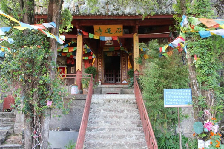 松云村蓮花山上有似虎口的巖洞,村民以為不吉,故建寺以堵虎口,以求平安,寺名曰:“石蓮寺”。后來(lái)曾有人在寺內(nèi)開(kāi)辦夜校,瑯瑯書(shū)聲,如祥瑞福音,人所稱道為“石蓮夜讀”。寺前有平地,地勢(shì)高曠,可以觀賞束河以及麗江壩子風(fēng)光。于2004年由束河高僧喜饒朗達(dá)大師倡議重修,今為束河著名景點(diǎn)。