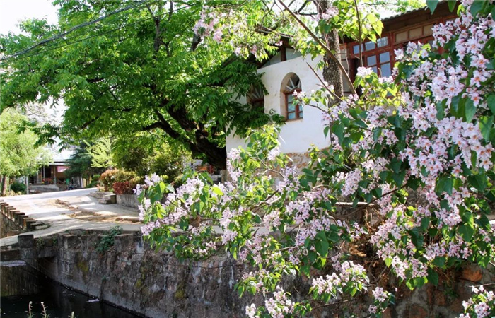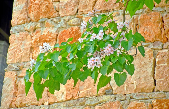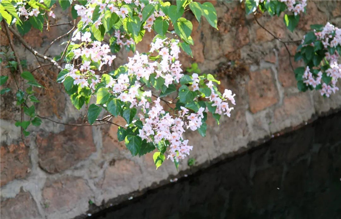 抬頭的瞬間,你會看見一簇簇的楸木花掛滿了枝頭,它們和枝條間垂下來“一縷縷青絲”共同映襯著一側(cè)的石墻,宛如一條條從山間流下的瀑布。時而隨風(fēng)奔騰,時而靜如處子。