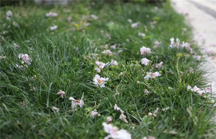 走進(jìn)祥和領(lǐng)域首先映入眼簾的不是那一樹樹盛開的楸木,而是隨風(fēng)飄落下來的一朵朵楸木花。她們輕輕的落在了草地上,落在了灌木叢間,靜靜的躺著?;ㄩ_花謝,皆自然的章法,而存在的每一刻都是永恒的美麗。