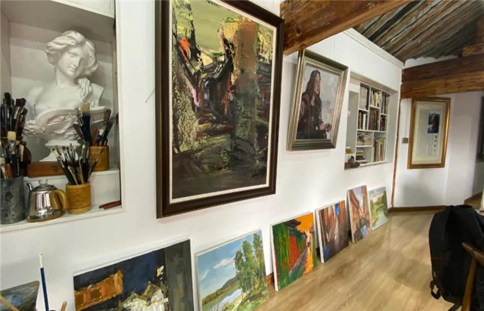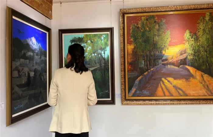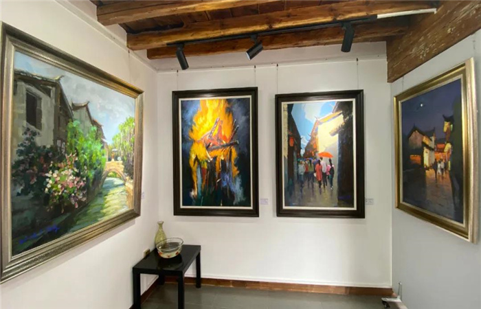 陶剛油畫藝術館位于五一街公房21號(近小石橋),現(xiàn)場展出了陶剛創(chuàng)作的部分作品。談及他的藝術創(chuàng)作從烙畫到油畫的轉變,他說:“我來麗江已經有二十來年了,剛開始我是被麗江的人文地理、風情風貌深深吸引,特別是麗江古城,這是一座自然而美麗的人間凈土讓我深深迷戀,我就決定留了下來,一開始我以烙畫的形式去描繪麗江古城,畫了很多年之后,我發(fā)現(xiàn)用單色去表現(xiàn)古城的美景還不夠,后來我就改變了我自己的畫風,開始用油畫創(chuàng)作。每當走在古城的街頭巷尾,每一天走的路都是同一條路,看到的卻是不同的景色,我強烈地想把這些表現(xiàn)出來?!?
