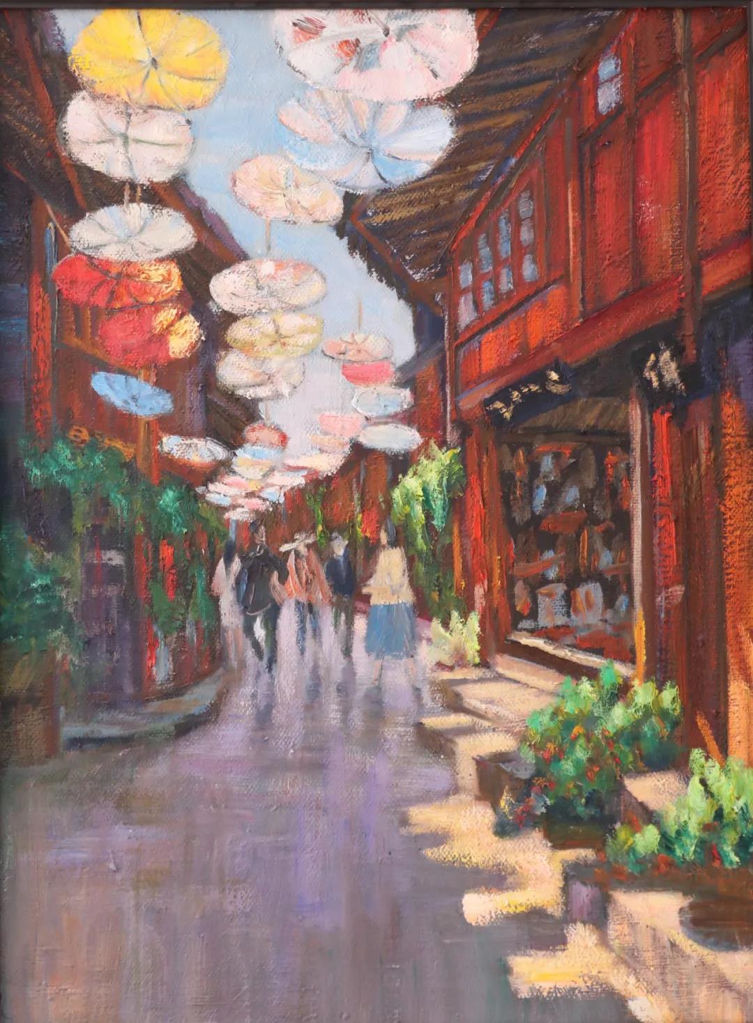 “烙畫很古樸也很適合用來(lái)畫古城,但總感覺(jué)用單色來(lái)表現(xiàn)古城的美還不夠,像藍(lán)天白云、朱紅大門就很適合用油畫來(lái)展現(xiàn)美感。”2010年初,陶剛開(kāi)始嘗試畫油畫,這一畫便再也停不下來(lái)。