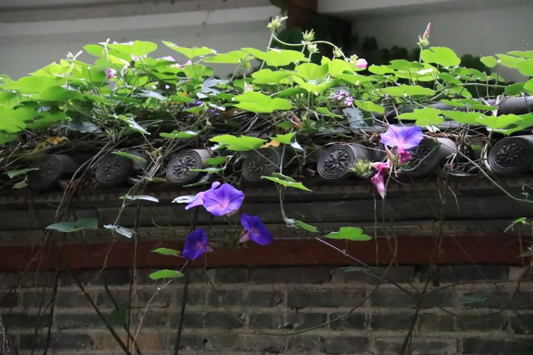 古城的夏天,當(dāng)季的花朵開始綻放,牽?;ㄇ那呐莱鰤︻^,它們順著藤蔓悄悄爬到水邊,也許它也被流水的聲音吸引了。