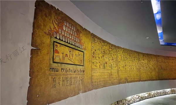 這里有“唯一活著的象形文字”——東巴象形文字墻。其長33米,高2.5米,東巴文單字700余個,共分為9大類別。東巴文是納西東巴所使用的一種民族文字,是世界記憶遺產(chǎn),被譽為世界上現(xiàn)存的“唯一活著的象形文字”。