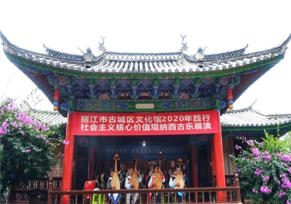 過了五孔橋不久,耳邊便傳來了陣陣古樂聲。朝前細(xì)看,古戲臺(tái)上十幾位老人正在表演納西古樂。在雨中觀看這樣的表演,不禁多了幾分凄美的意境,別有一番韻味。