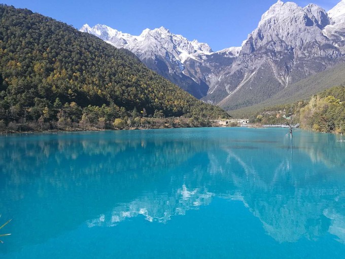 景如其名,水很清澈很藍(lán),也有小九寨溝之稱,因?yàn)樗途耪瘻弦粯雍苊利?。這里的水之所以是藍(lán)色的,是因?yàn)楹椎V石富含銅離子,反射藍(lán)色光芒,像是一塊藍(lán)色的湖水狀寶石躺在山間。在這里隨意拍下的景和人畫面都超級(jí)贊,無須任何后期加工。