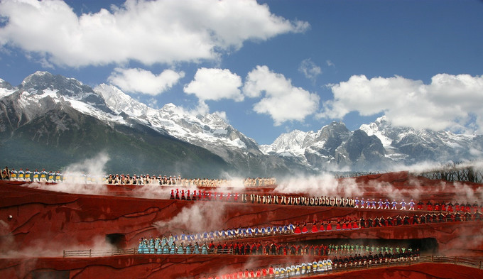 張藝謀導(dǎo)演的以玉龍雪山為背景的大型實(shí)景演出,全篇分為“古道馬幫”、“對(duì)酒雪山”、“天上人間”、“打跳組歌”、“鼓舞祭天”和“祈福儀式”六個(gè)部分,展現(xiàn)了獨(dú)屬于麗江的風(fēng)土人情。沒有舞臺(tái)燈光,來自10幾個(gè)少數(shù)民族的500多個(gè)普通的農(nóng)民只是以雪山為景,用最自然最樸實(shí)的演出,最質(zhì)樸的歌聲,與天地共舞,與自然同聲,很是震撼,值得觀看。