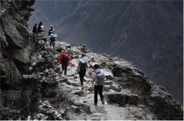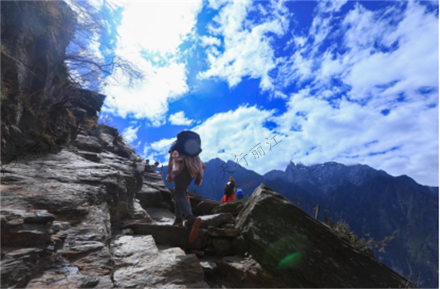 沿著高路步道繼續(xù)前行,一路走過(guò)驚險(xiǎn)的崖邊步道,沿途盡是面朝玉龍雪山群峰,俯視雪山下的大峽谷,景色無(wú)比震撼。最后抵達(dá)本地灣入住今晚的客棧,天氣好的情況下可以欣賞玉龍雪山的日落與夜晚的無(wú)盡星空