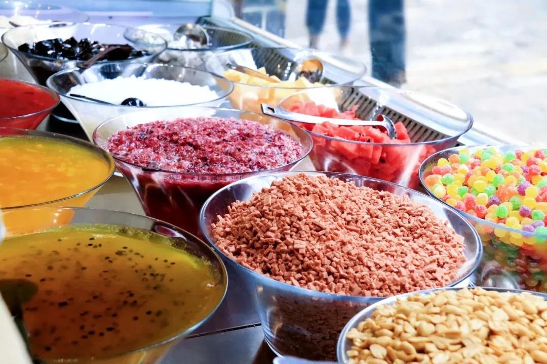 在店主的調(diào)配下,水果冰粉和干果冰粉滿足不同口味人群的需求。水果冰粉的口感更加順滑,清甜的水果和冰粉在烈陽秋日帶來陣陣涼爽,干果冰粉里的紅棗,花生碎,山楂,芝麻和再加上椰果粒和酸甜可口的果醬,每一口都是驚喜。