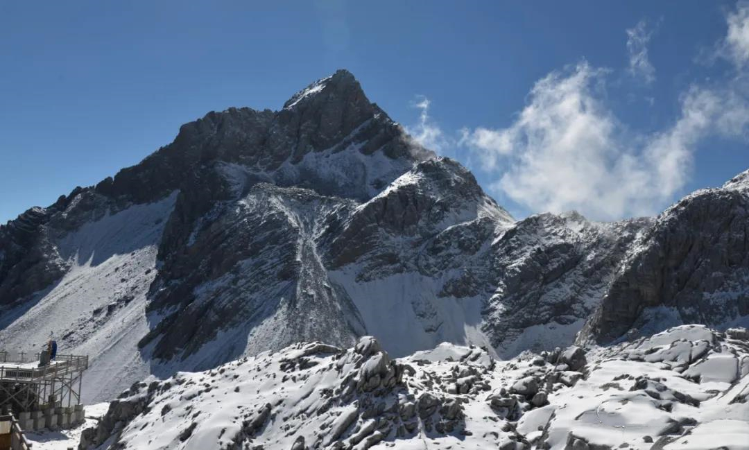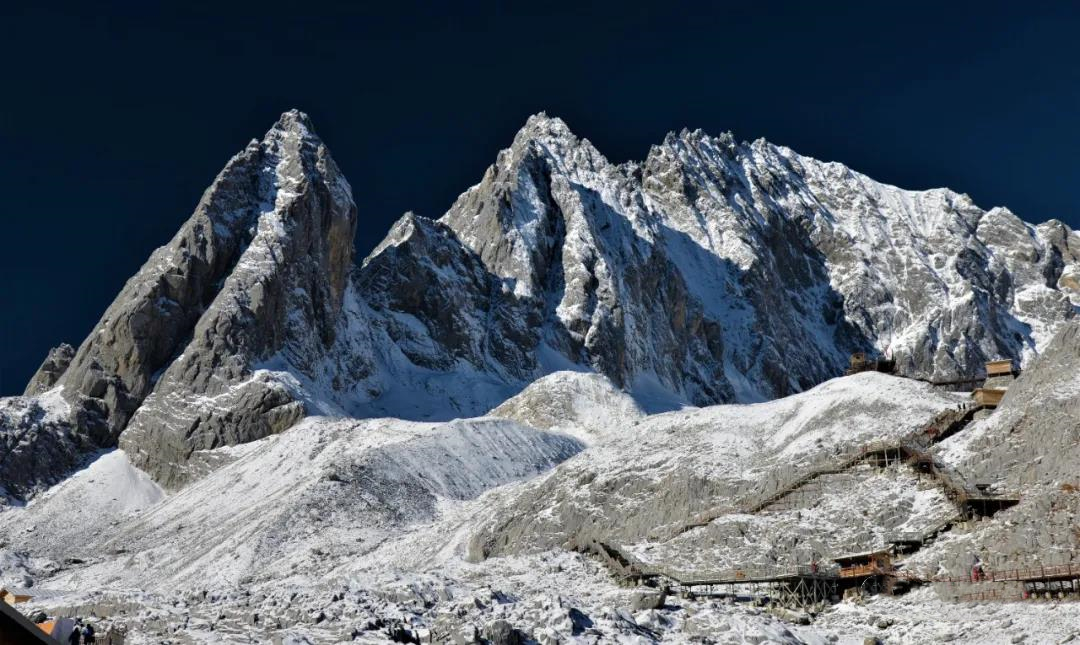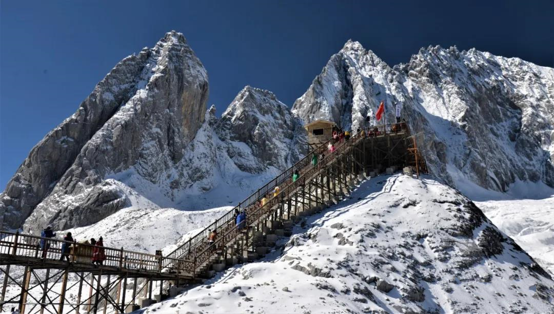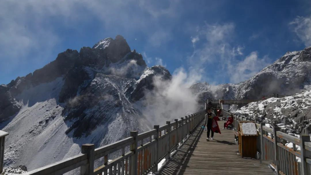 冰川公園位于海拔4506米扇子暴陡下方的冰川區(qū),沿著木制棧道上升約180米,直到的觀景平臺,這是最近距離接近玉龍雪山冰川的觀景勝地。天氣晴好,向下一眼望去,那一汪深藍,便是著名的藍月谷了。