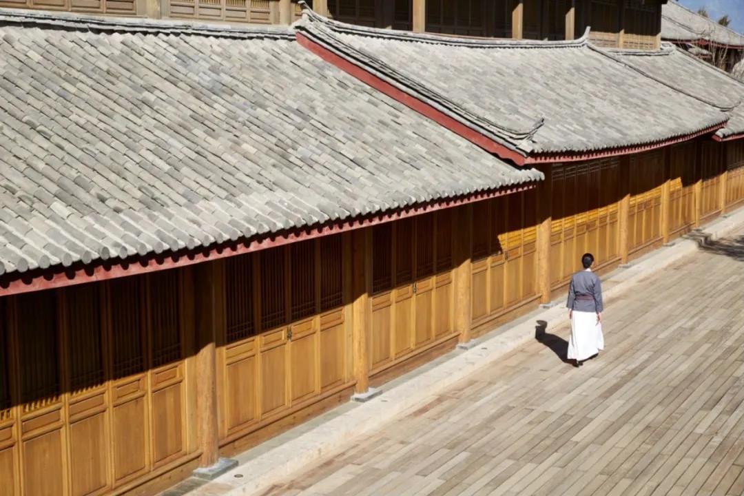 納西建筑的倒影映射在白墻上,走在大研安縵里,像是欣賞著一座微縮版的麗江古城。