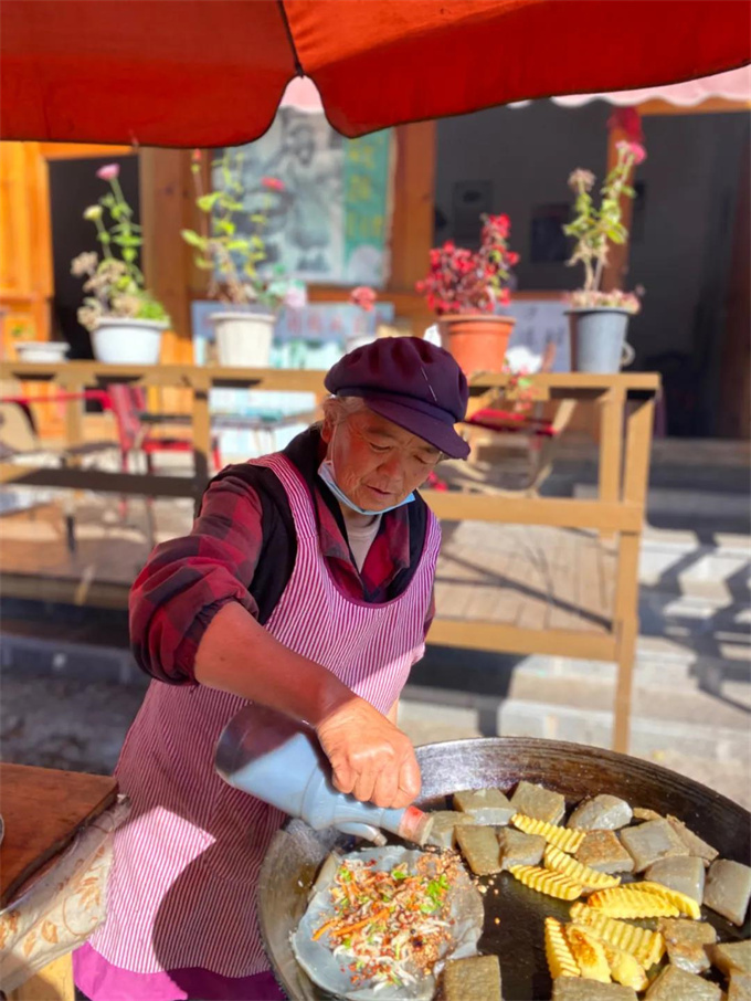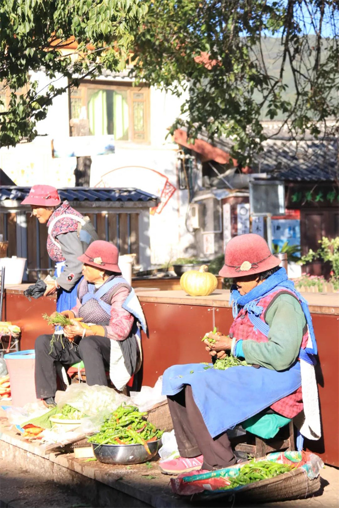 生活的模樣就在這里,在白沙生活的人們是那么的淳樸,街邊坐著賣菜的奶奶,“買一把菜走嘛,都是自己家菜地里種的,沒有一點農(nóng)藥。”她向經(jīng)過的路人介紹自己的蔬菜,但是不慌不忙,因為她根本不著急把菜賣完。伴著陽光,這幅畫面就是人間的煙火氣。到了白沙,吃上一碗雞豆涼粉,方不虛此行。街頭賣涼粉的奶奶嬢嬢們,熱情地招呼每一個光顧的客人,味道正、分量足,是她們永遠(yuǎn)不變的招牌。慢慢悠悠地走在街邊,你會看到幾個難得清閑的納西嬢嬢站在街邊嘮著家常,麗江的陽光讓她們的皮膚有些黝黑,可是面龐總是帶著生活的朝氣,或許是白沙這暖暖的生活氣息,滋養(yǎng)了這里淳樸的人們。