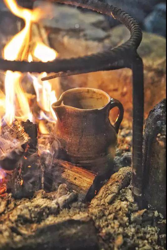 歡聲笑語間,陶罐里的茶水已經(jīng)完全沸騰開來,噗噗作響,偶爾有幾滴濺到火塘中,一股濃郁的茶香撲鼻而來。