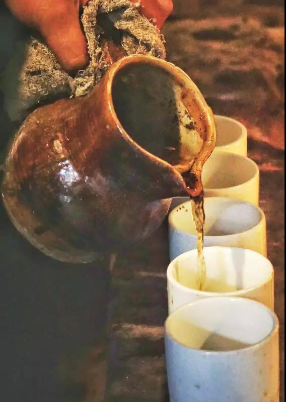 將陶罐里的茶湯緩緩倒入杯中,深黃色的茶湯散發(fā)出濃郁的茶香,這時(shí)的茶湯并不能直接飲用,“直接喝很多人受不了,會(huì)喝醉。”蜂向勇在杯中加入一些開水,原本深黃色的茶湯漸漸變淡,呈現(xiàn)出晶瑩剔透的樣子。