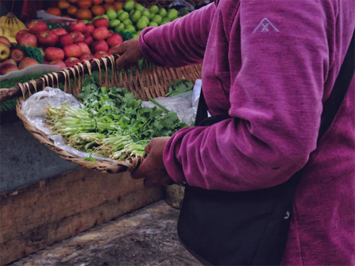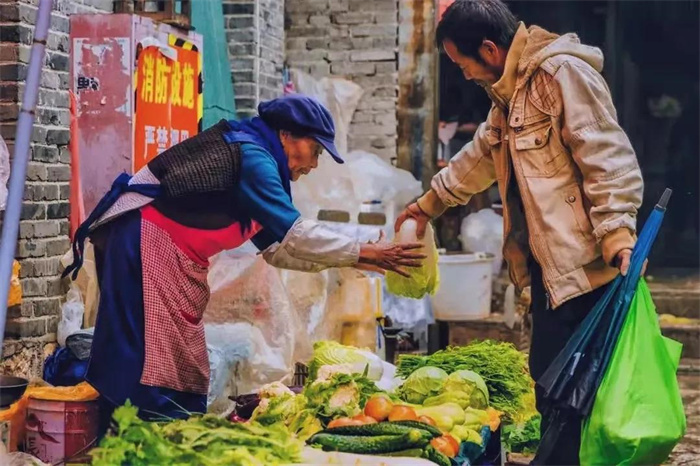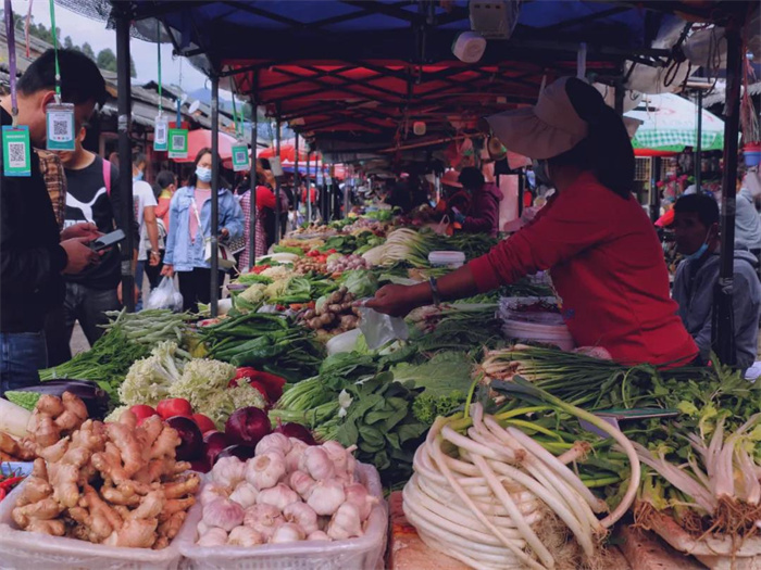 在市場里,時常會遇見上了年紀的納西阿奶和新潮時尚的游客擦肩而過;有依然使用老式桿秤,只收現(xiàn)金的老奶奶;卻隨處可見電子秤和微信收款二維碼;有納西人家后院自種的青菜小蔥和瓜果,也有經(jīng)過改良的大棚優(yōu)質茄子蘿卜和白菜……