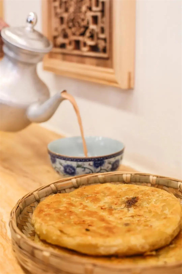 掌握了“朋友的習性”,備好的面團在手里便十分“溫順”,不稀不硬,不縮不塌。取一段面團,搟成毛巾大小的面餅,抓一把化油和油酥均勻抹上,咸口或是鮮肉的還需要撒上椒鹽、蔥花或者肉末,然后雙手輕輕托起“毛巾”兩段,將它慢慢拉到一米長,面皮變得薄如書紙,再將它卷起來,過油煎炸時就將出現(xiàn)層層脆皮。“以前都是一個個做,現(xiàn)在是一長條呢搞出來,再一個個呢搟,手法創(chuàng)新了,做得也更快一點了?!崩畲悍颊f,卷好的面團稍稍醒發(fā)后揪作一段段小面團,椒鹽火腿的要沾上火腿末,甜口的則要裹入紅糖,再用搟面杖一點點將面團搟成巴掌大小的圓形粑粑即可等候煎炸。搟好的粑粑順次放入電餅鐺,菜籽油在微微斜置的餅鐺里有淺有深,粑粑“由淺入深,再由深入淺”一個輪回后,表皮瞬間變得金黃。紅糖餡的粑粑最考驗手法,稍有差錯就會讓紅糖溢出,搞糊整鍋。翻面也是個技術活路,若是用力過猛,粑粑會被攪得稀碎。等油脂在粑粑表面的縫隙滋滋作響,冒出熱氣時,一塊麗江粑粑就大功告成了!在麗江粑粑的口味問題上,游客與麗江人有著巨大“分歧”。游客愛咸口、愛肉餡,李春芳和女兒還為此增加了一種鮮肉口味;麗江人則更鐘情紅糖餡,一口粑粑就能滿足人們對油脂與甜味的追求。吃粑粑還得配佳飲,清香的紅茶能解粑粑的油膩,醇香的酥油茶能讓回味更加無窮。當然,你也可以試試肥宅快樂水,粑粑可能會更加甜美!
