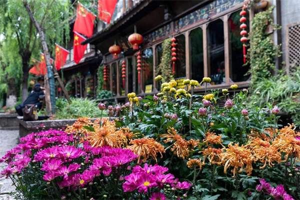 有人說秋天的麗江古城是藍色、紅色和金色交織的,藍色是天空,紅色是隨處招展的五星紅旗,金色的則是一年一度滿城盛開的菊花。300個品種的35132盆菊花將古城裝扮一新,五彩斑斕的景象令人沉醉。