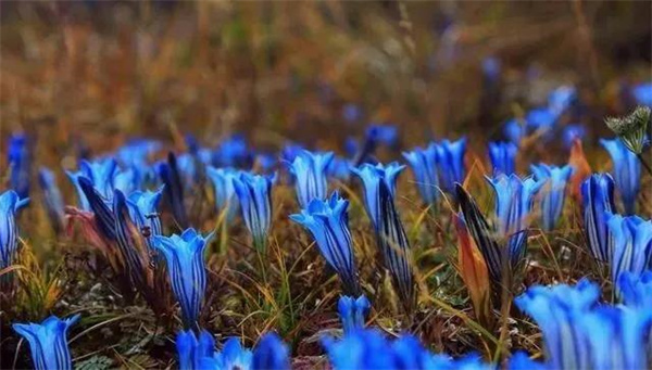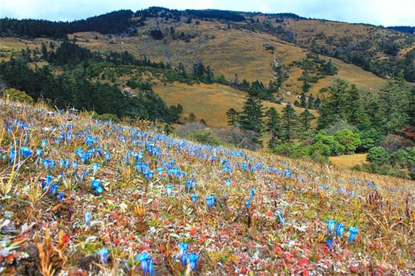 最令人驚喜的是鳶尾谷的大花龍膽,這種色彩鮮艷的高山植物花期很遲,一直到11月都仍在盛開,遠遠上去,好像為秋天金黃的牧場蓋了一條鮮花織成的毛毯。