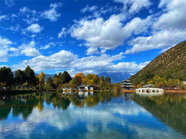 麗江不需要濾鏡的藍(lán)天白云倒映在湖水之中,如油畫般絢爛。站在五孔橋上看見了遠(yuǎn)處的雪山,驚艷了雙眸