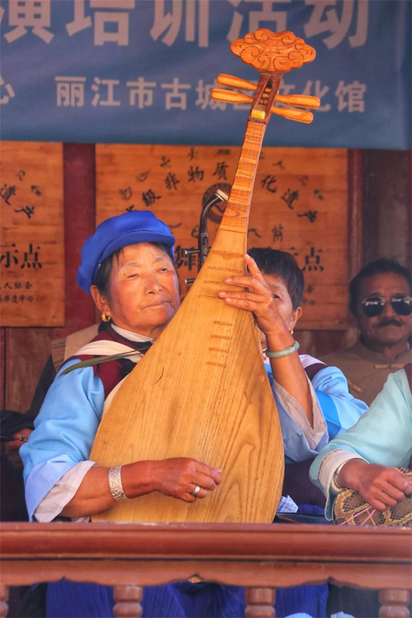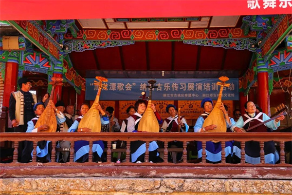 黑龍?zhí)兜膽蚺_(tái)傳來悠揚(yáng)的音樂聲,原來是在演奏納西古樂,聽著古樂看著風(fēng)景也是一種生活