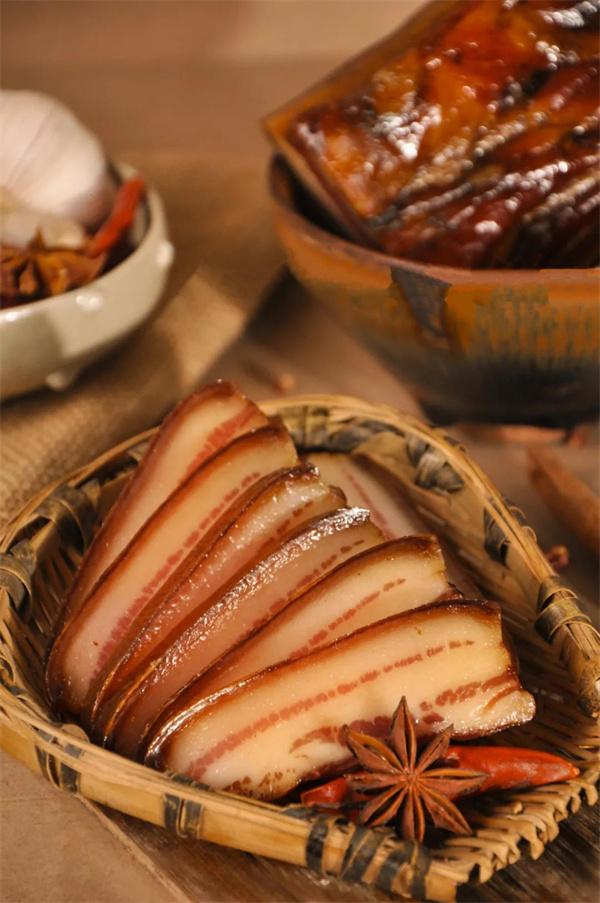 風(fēng)干后的臘肉,赤紅乳白看著就能讓人滿心歡喜,切開后紅白相間,甚是美味,紅的是瘦肉,白的是肥肉,兩肉配合才是臘味無雙的好搭檔。正如《舌尖上的中國》里對臘肉的描述:“這是鹽的味道,山的味道,風(fēng)的味道,陽光的味道,也是時間的味道,人情的味道。”