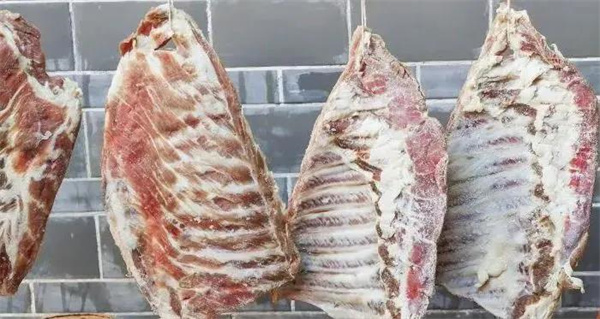 先用烈酒抹遍豬肉全身,再將豬肉放到大缸子里撒上鹽均勻涂抹、腌漬,接著找家里通風(fēng)好的位置晾上,臘肉就算腌好了。