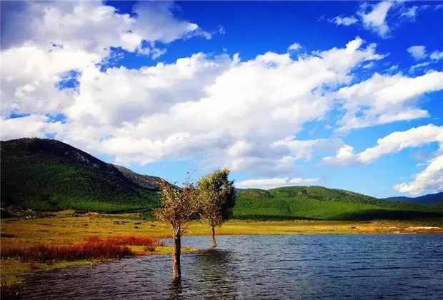 玉湖中,雪水清澈,水草搖曳,藍(lán)天白云襯托著高大的玉龍雪峰倒映在湖中,大自然仿佛都沉淀在湖底。沒有都市的喧囂,沒有凡俗的熙攘,你可以靜靜的吹著風(fēng),看著牛羊,感受遠(yuǎn)處飄來的清新花香。