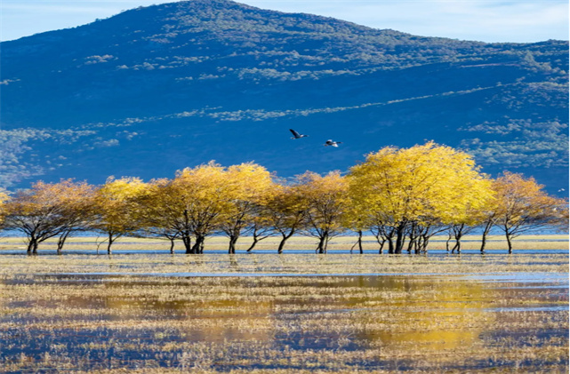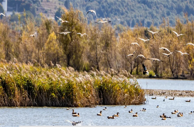 不但鳥多,風(fēng)景也正好看!初冬的拉市,湖光山色,層林盡染,候鳥的倩影點(diǎn)綴其間,相映成韻。目光所及,皆是詩畫。