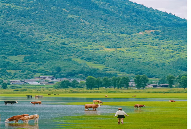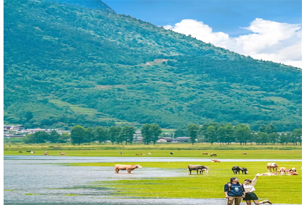文海,這里有種新疆伊犁的感覺,牛群在湖邊的草地自由自在吃著草,遠處是青山和雪山,真的像走進畫里。