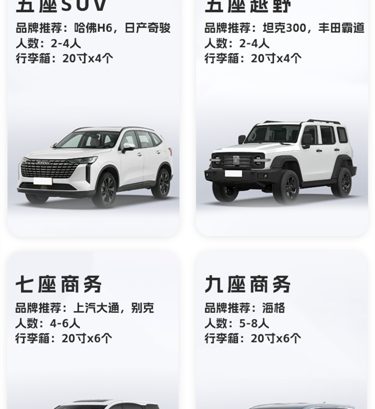轎車、五座SUV、七座九座商務(wù)車等車型不同,
