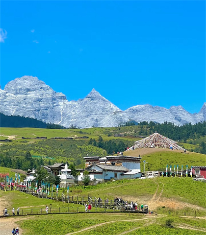 甘海子位于玉龍雪山東麓,原為高山冰蝕湖泊,后因雪線上升,積水減少以至干涸,人稱“干海子”,甘海子是一個三面環(huán)山的高原草甸,能夠縱覽玉龍雪山全貌,整個大草甸長約4公里,寬約1.5公里,長滿了茂密的牧草和低矮的灌木林。甘海子是玉龍雪山旅游區(qū)的游客集散中心,可為游客提供食、住、游、行、娛、購等服務(wù)。這里有世界球道最長、亞洲海拔最高、唯一在雪山腳下的高爾夫球場。