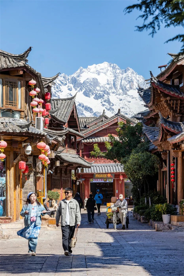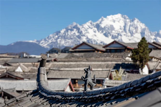 玉龍雪山在屋檐上若隱若現(xiàn),銀冠映照著青瓦,宛如老東巴蘸著雪水書寫的象形文字,神秘而古老,讓人心生敬畏。