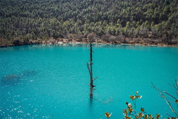扎進翡翠秘境中,藍月谷像春天打翻的調(diào)色盤,陽光下的湖水泛起明艷的藍,潭水倒映著岸邊的景色和遠處的雪山,棧