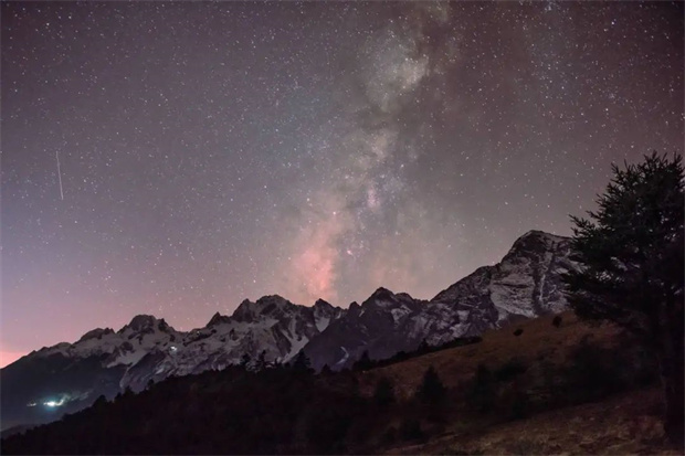 在雪山腳下,赴一場星空之約,春日夜空清朗,點點繁星織起了夜色的動人,白天看過了雪山的好風光,在寧靜的夜晚
