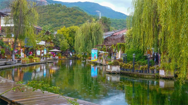 的春意;再看那滿眼的綠意,遠(yuǎn)處的青山、近處的流水和眼前的綠葉,讓整個束河從沉睡中蘇醒,煥發(fā)著蓬勃的朝氣。