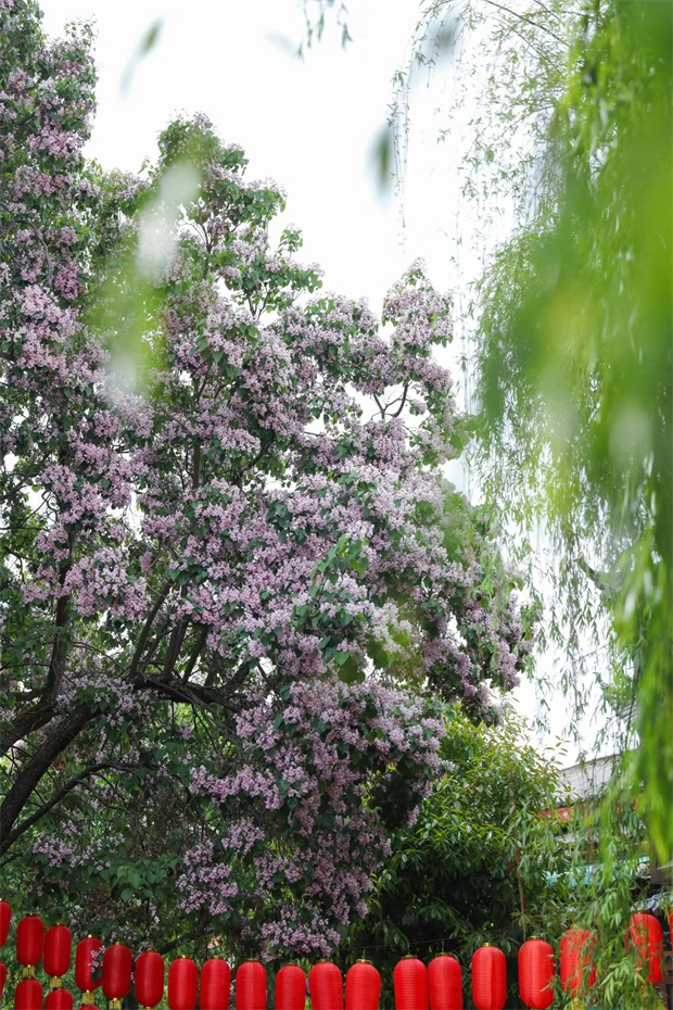 掛起紅燈籠,光影搖曳,與楸木花相映成趣。有人倚著雕花欄桿,看花瓣隨風(fēng)飄向遠(yuǎn)方,忽然明白,束河的美,美在不
