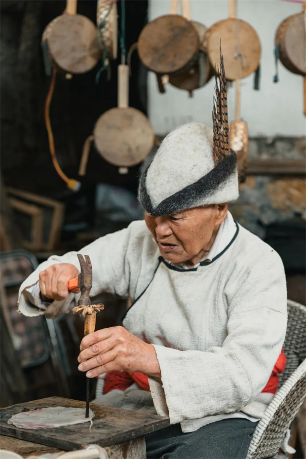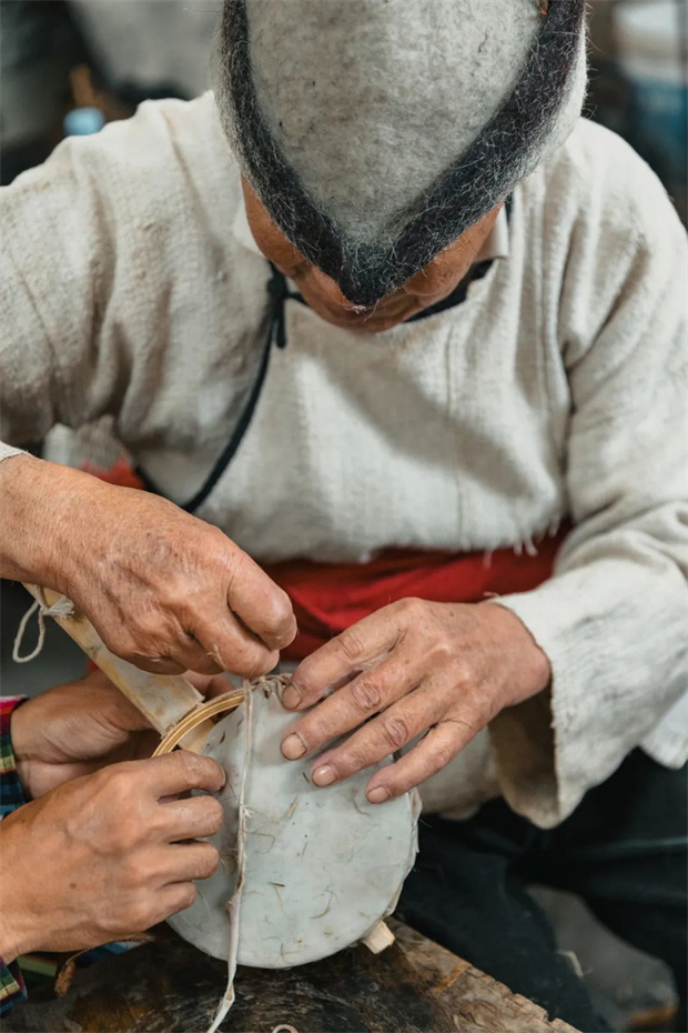 需在清泉中浸潤數(shù)月,再經(jīng)松煙文火耐心熏蒸,方能在彎曲成完美鼓圈時不裂不折。橫斷山的羊皮則要與石灰水共處七
