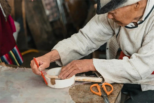 皮保持著精準(zhǔn)的角度?!斑@力道,就像跳勒巴舞時的踏腳,得拿捏到位?!痹捳Z間,滿是對千年技藝的敬畏。|