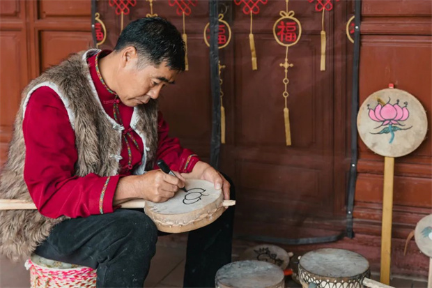 鼓面彩繪,則是凝固的時光詩篇。李學(xué)高執(zhí)起彩筆:男鼓上勾勒海螺圖騰,螺旋紋如同時光年輪,仿佛能聽見東巴經(jīng)卷