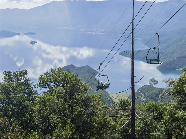 全景索道體驗:乘坐瀘沽湖唯一索道登頂格姆女神山,海拔3450米,垂直落差642米,單程20分鐘。上行穿越森林,偶