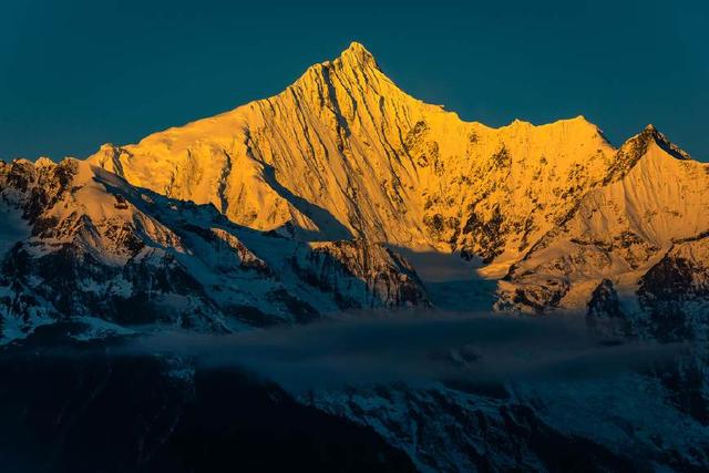 最高峰卡瓦格博峰海拔高度為6740米,是云南省最高的山峰,位于德欽縣西南方10千米處,距中甸縣城184千米。長約30公里,其中呈金字塔狀的最高峰為卡瓦格博峰,海拔6740米,為突出于周圍群山山頂面近千米的極高山,是云南省的最高峰。梅里雪山斷裂活動強(qiáng)烈地勢高聳,有13座海拔6000米以上高峰在卡瓦格博峰周邊環(huán)繞,是青藏高原東南緣最高山。