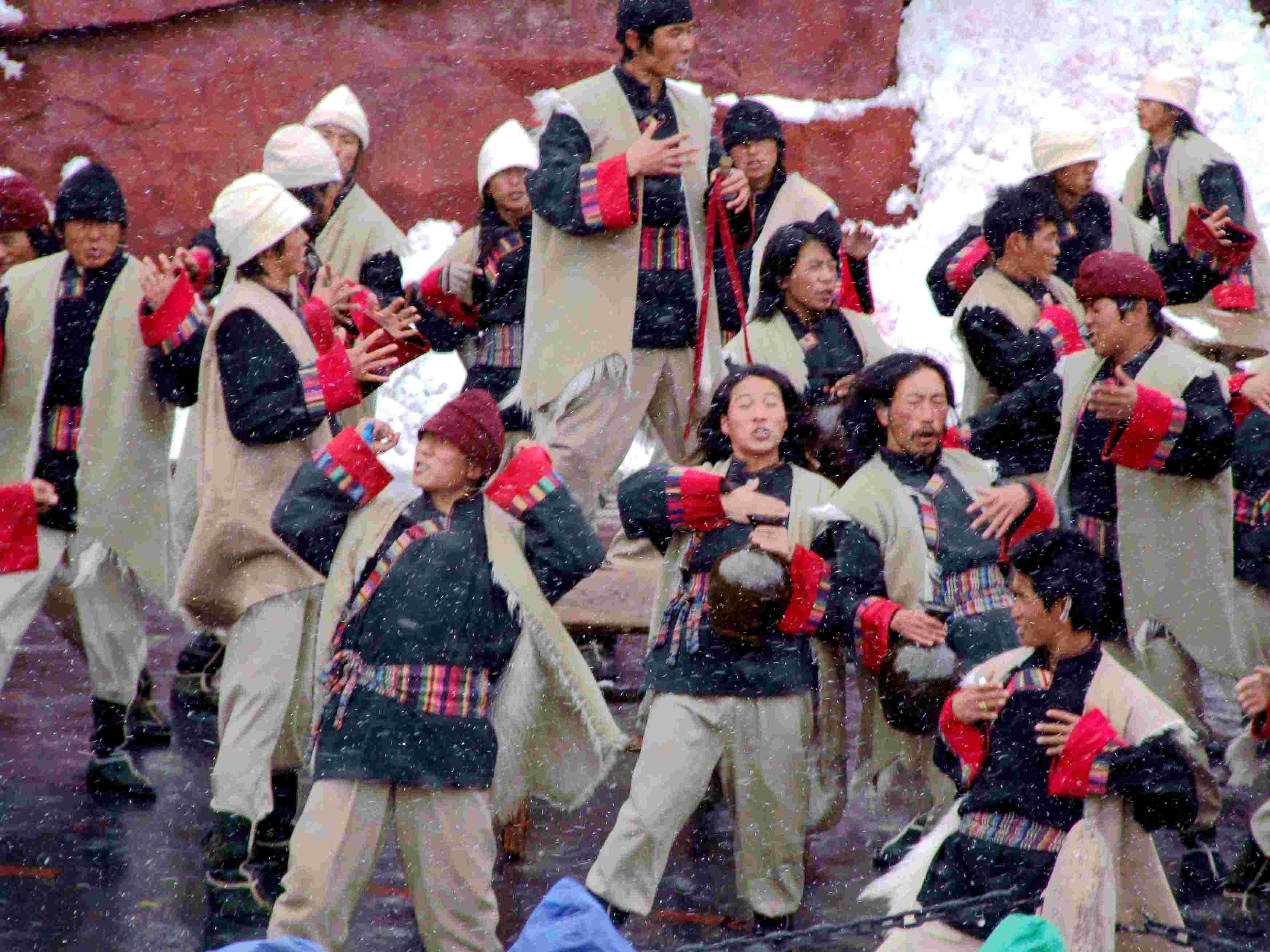在夜晚的燈光下,可以掩飾、隱藏并突出一些東西,白天演出則完全無法使用這些藝術手段”,“我在日光下真切感受到了那種撲面而來的粗獷、自然的氣息,在雪山的映照下,構成白天演出的一大特色,反而成為一種全新的體驗?!?-張藝謀
