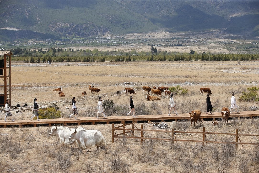 發(fā)布會秀場真實還原了當?shù)赜文磷迦旱纳顚嵕?,以雪山為背景,取自然之大成,木堆、瞭望塔、草垛、柵欄、牛羊等元素裝飾凌空而起,將靈性自然的意境躍然眼前,以最直觀的方式將原生態(tài)韻味展現(xiàn)給現(xiàn)場觀秀嘉賓。