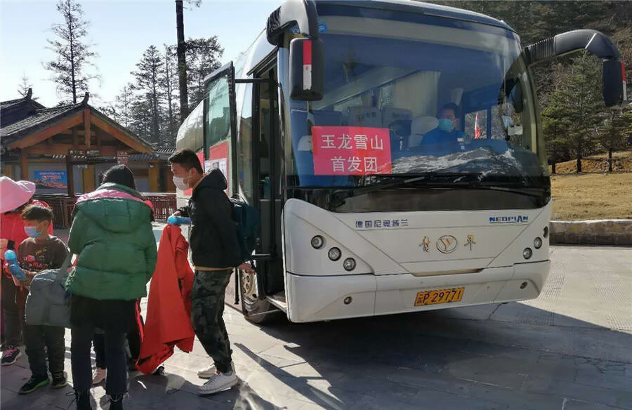 玉龍雪山銀裝素裹、麗江大地鮮花盛開。3月22日上午,麗江市多家旅行社在暫停經(jīng)營旅游團(tuán)隊業(yè)務(wù)59天后迎來首發(fā)團(tuán)。“掃碼了嗎?身份證帶了嗎?座位上貼有請勿入座標(biāo)志的,大家不要坐?!彼妮v大巴車前,游客有序地排著隊,導(dǎo)游和旅行社工作人員在挨個為游客測量體溫進(jìn)行登記時,口中一遍遍重復(fù)著注意事項。在進(jìn)行了簡短的首發(fā)儀式后,85名游客通過掃碼、測溫,分別登上了前往玉龍雪山、瀘沽湖和老君山的旅游大巴。