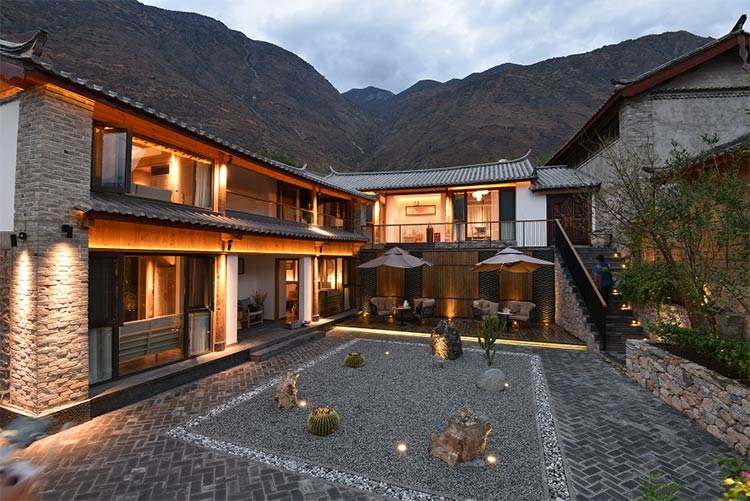 麗江寶山石頭城棲云山房位于麗江城北110公里的金沙江峽谷中的寶山石頭城上,因百余戶人家聚居在一座獨(dú)立的蘑菇狀巨石之上而得名。麗江寶山石頭城納西語(yǔ)稱為“拉伯魯盤塢”,意為“寶山白石寨”,城內(nèi)瓦屋鱗鱗,巷道縱橫,麗江納西族居民辟巖建屋,房屋柱石和房沿石均隨勢(shì)打成,古樸自然,奇絕無(wú)窮。麗江寶山石頭城三面皆是懸崖絕壁,一面石坡直插金沙江,僅有南北兩座石門可供出入,是一座真正的天險(xiǎn)之城。