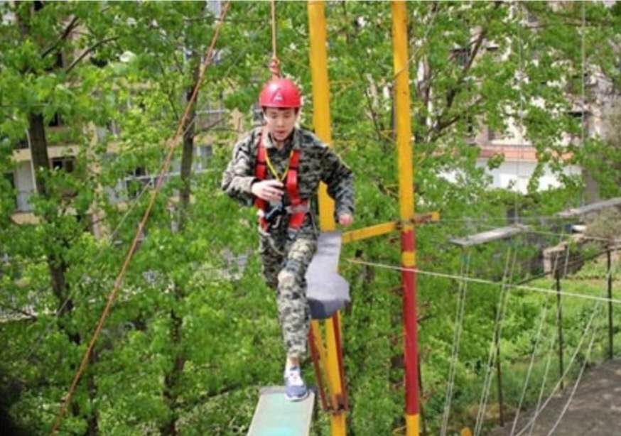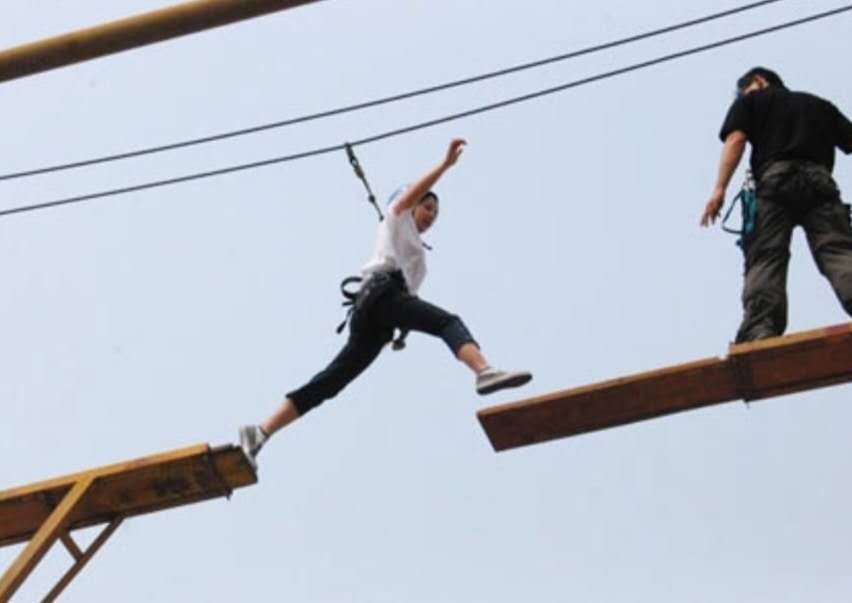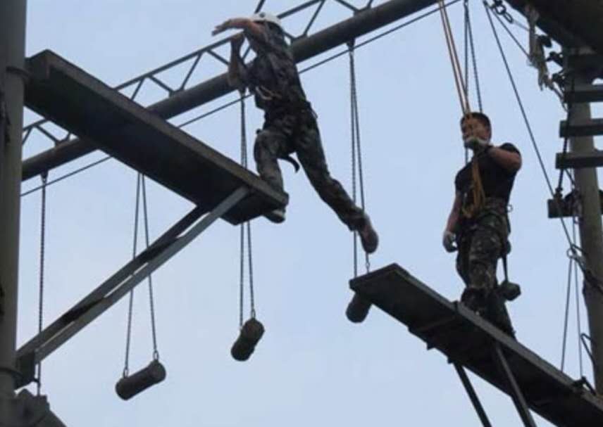 高空斷橋操作流程:學(xué)員站在板上,眼睛注視前方,起步、跨躍、落地。如果有人問你能否一步邁過1.1米的距離,你可能會覺得有些好笑,那有什么難的?但是,試想一下把這個距離放到8米高空,你腳下踩的是一塊只有0.3米寬、1米左右長的鋼板,要跨到另一塊同樣細(xì)長的鋼板上,兩者之間雖然只有1.1米,你能保證自己心里一點的也不打鼓嗎?高空斷橋就是通過讓你在高空邁過這艱難一步來進行心理訓(xùn)練,它能令你勇氣倍增。