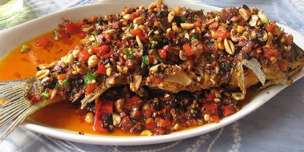 ”東巴烤魚(yú)”是麗江茶馬古道上流行起來(lái)的一道美食。東巴烤魚(yú)的做法是先把魚(yú)肚剖開(kāi)去除內(nèi)臟后,陌上了鹽,花椒,和五香粉腌制了一段時(shí)間,在放在鐵鍋里先用慢火烤制等到味道吸收之后再放到油鍋里炸。整條烤魚(yú)外脆內(nèi)嫩,吃起來(lái)味道非常鮮美。配合風(fēng)味的豆豉在一起,整個(gè)魚(yú)的風(fēng)味非常香。再加上各種美味的佐料配合在一起,讓人回味無(wú)窮。東巴烤魚(yú)一定是到麗江必吃的一道菜”。麗江無(wú)論是小餐館還是納西餐館都有。