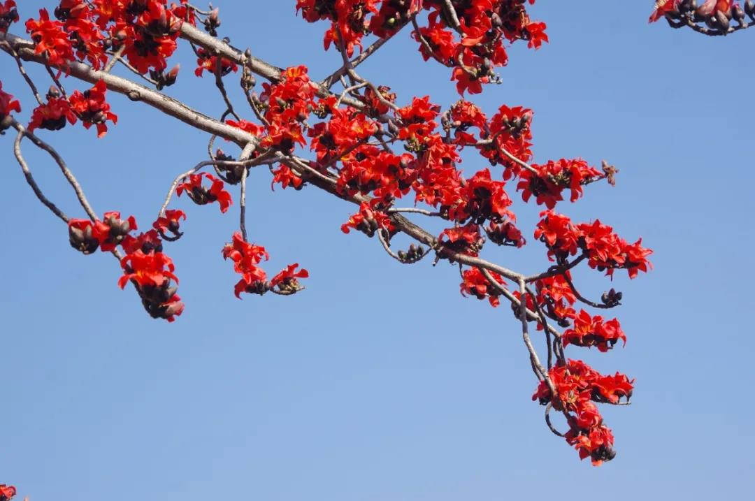 一株株木棉,昂首挺立。常言道,紅花也需綠葉襯??伤鼜牟坏染G葉萌發(fā)就綻開撩人心扉的花朵。鮮艷的紅色大花點(diǎn)綴枝頭,似火苗在跳動,一團(tuán)團(tuán)、一簇簇、一片片,開得轟轟烈烈、紅紅火火,令人激情滿懷。
