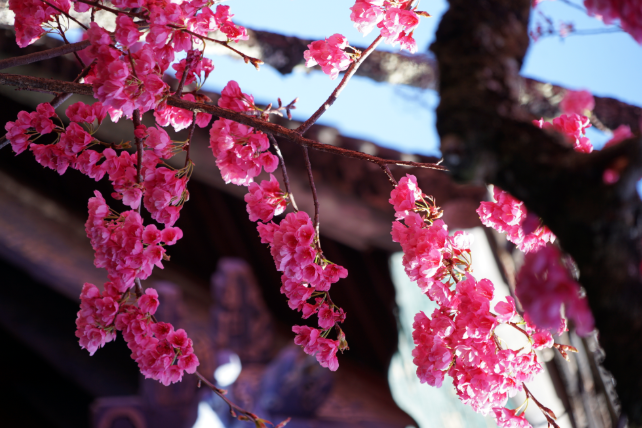這或許要歸功于寺院中那兩棵高大繁茂的櫻樹,它們四散擎滿花朵的枝干,為幽深寂靜的古寺院落撐起了兩把巨大的花傘,紛繁嬌俏的粉色瞬時間把原本肅穆冷寂的院落渲染得分外清麗雅致。